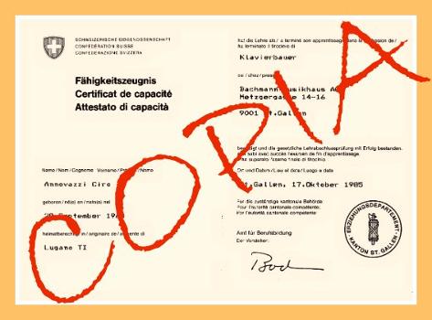 A 17 anni ho iniziato la scuola di costruttore ed accordatore di pianoforti a Zurigo. Ho fatto pratica presso la ditta Bachmann di San Gallo frequentando i corsi di perfezionamento alla Burger & Jacobi di Bienne.